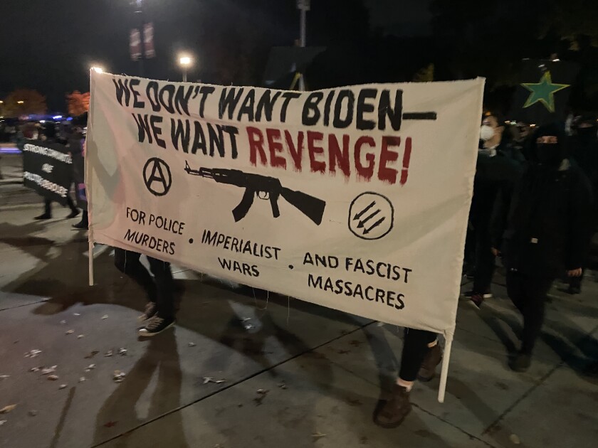 The Portland Police Bureau said several events were planned in the city just hours after Biden was sworn in and implored the nation to come together. A crowd of up to 150 people gathered at Revolution Hall around 2 p.m. and marched to the headquarters of the Democratic Party of Oregon, Portland police Sgt. Kevin Allen said.
