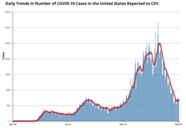 Yes, we dropped significantly from the peak of new cases (255,000 7-day moving average as of Jan 11th). But that drop appears to be done. We’ve been at a stable baseline for about 2 weeks.