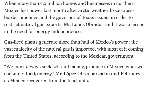 Mexico’s dependence on foreign hydrocarbons was highlighted last month when a winter storm in Texas led to the interruption of natural gas deliveries from the United States, the source of most of the natural gas used in Mexico. Mr. López Obrador pointed to the ensuing blackouts as evidence of the need to lower dependence on foreign energy."