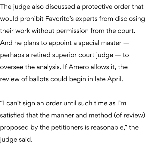 Based on Post 10, it sounds like the stall tactics are in good working order. The review of the ballots won't ostensibly begin until the end of April (6 weeks from now), with a statement that allowed wiggle room to delay it further.