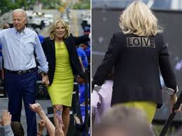 The first lady wore a black jacket with the word “love” outlined on the back in silver beading as she and the president met with British Prime Minister Boris Johnson and his wife Thursday. She wore the same jacket more than two years ago to kick off Biden’s presidential campaign.