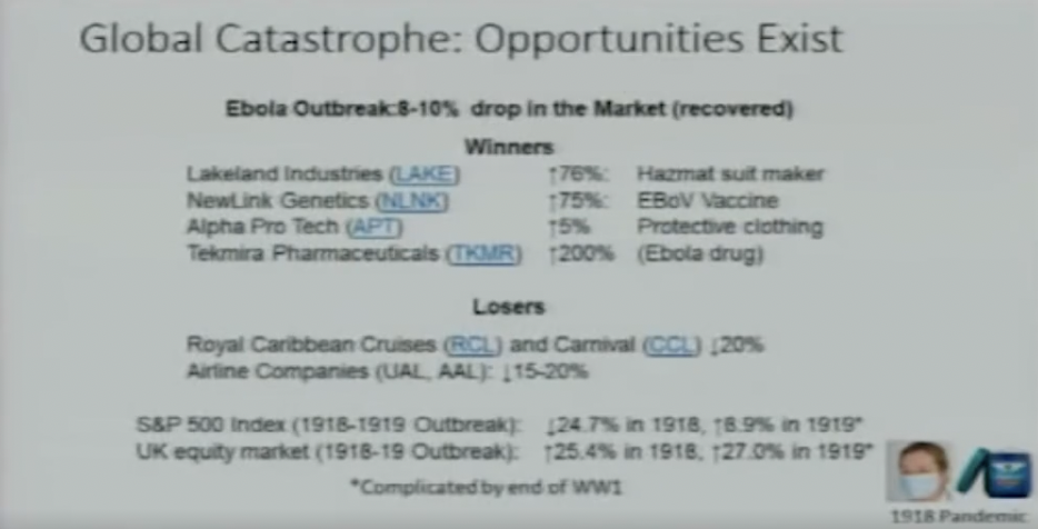 “I wanted to give you good news. There are winners out there, right? So if you ever want to be prepared and make money in the next pandemic, if that’s what you want to do, buy stock in Hazmat suit makers and protective clothing or companies that make antiviral drugs for that particular pandemic.”