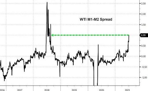 The market agrees: not only are spot prices surging, but WTI prompt backwardation surged, with the nearest timespread touching $1 a barrel intraday, rising as much as 30c, the strongest since September 2019, and trading at 86c as of 7:33am New York time, an indication the market sees supply deficits extending for a long time.