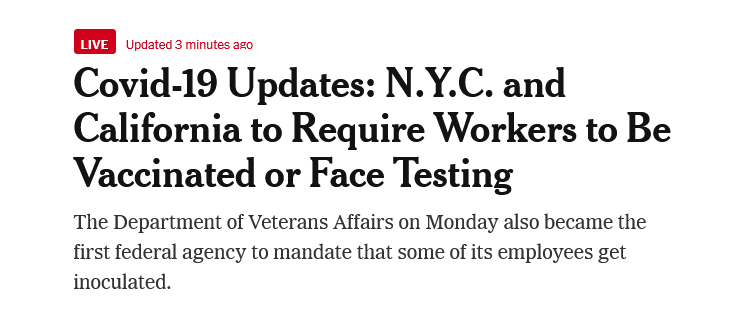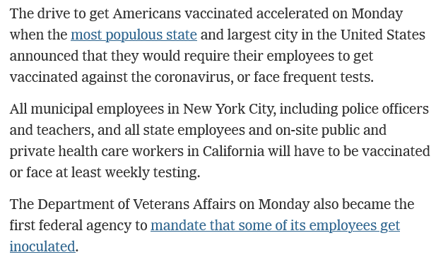The policy doesn’t quite equal a mandate in that workers will be able to keep their jobs without having to get the vaccine as long as they submit to testing. Government employees may be required to comply as soon as next week, while healthcare workers in private and public hospital systems will have until late August to get the shots if they so choose.