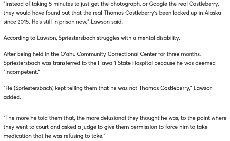 "Instead of taking 5 minutes to just get the photograph, or Google the real Castleberry, they would have found out that the real Thomas Castleberry's been locked up in Alaska since 2015. He's still in prison now," Lawson said. OOPS!...............................