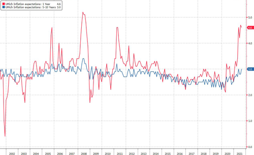 Even more ominously, while short-term inflation expectations eased very modestly, longer-term expectations rebounded back to multiyear highs (inflation was expected to average 3.0% over the next five years, up from 2.8% in the past two months, regaining the same level as in May.)…