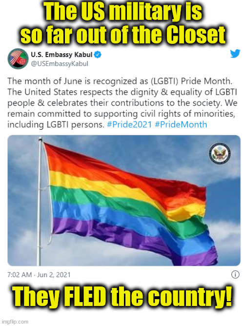 But, the women....Oh, the horror. Didn’t we go to war with Afghanistan to protect the women, according to the media and Dem identity politics narrative? Does this mean virtuous progressives here are flooding recruiting offices to volunteer to head to Afghanistan to protect the women? Highly doubt they are going to give up their unemployment checks and rent free eviction free apartments to do anything for anyone other than themselves.