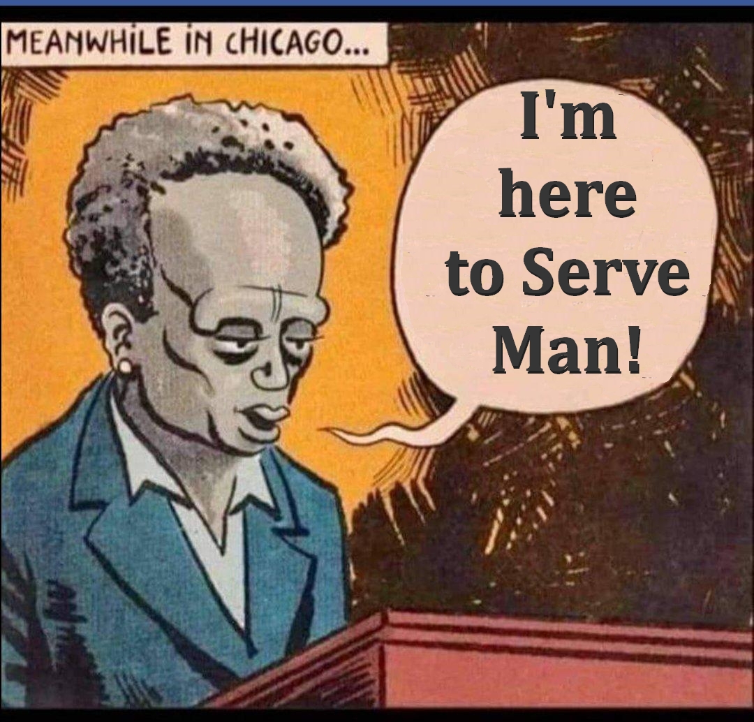 But as one of the most gullible American scientists was happily ascending an escalator onto the spaceship, his terrified colleague ran to the bottom of the escalator and—too late—warned him that they had finally deciphered To Serve Man: it was a cookbook! (Fade to black.)