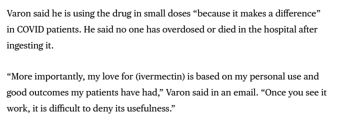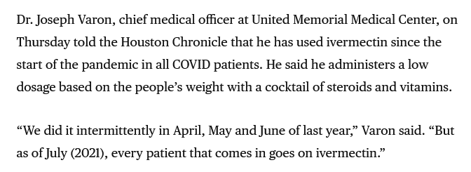 Dr. Joseph Varon, chief medical officer at United Memorial Medical Center, on Thursday told the Houston Chronicle that he has used ivermectin since the start of the pandemic in all COVID patients. He said he administers a low dosage based on the people’s weight with a cocktail of steroids and vitamins.
