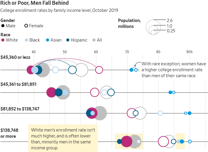 At the close of the 2020-21 academic year, women made up 59.5% of college students, an all-time high, and men 40.5%, according to enrollment data from the National Student Clearinghouse, a nonprofit research group. U.S. colleges and universities had 1.5 million fewer students compared with five years ago, and men accounted for 71% of the decline.