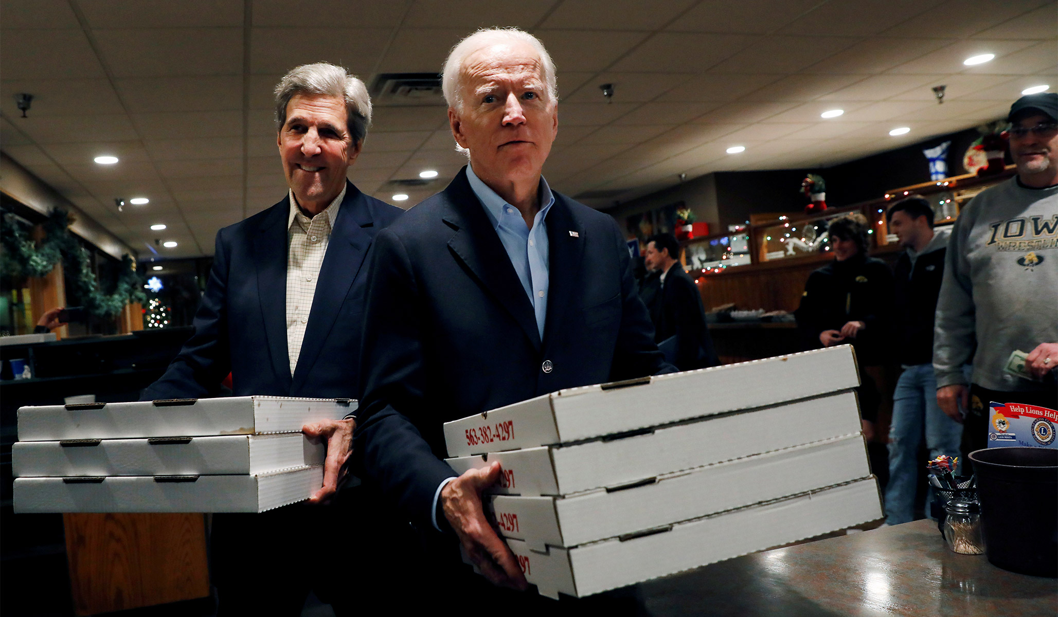 Former Vice President Joe Biden (right) and former Democratic presidential nominee John Kerry carry pizza boxes after an event on Biden’s “No Malarkey!” campaign bus tour in Decorah, Iowa, December 6, 2019. (Shannon Stapleton/Reuters)