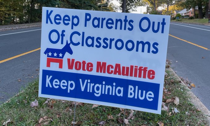 On Monday, the Gateway Pundit reported that yard signs are popping up across Virginia that read, “Keep parents out of classrooms,” followed by, “Vote McAuliffe” and “Keep Virginia Blue.”