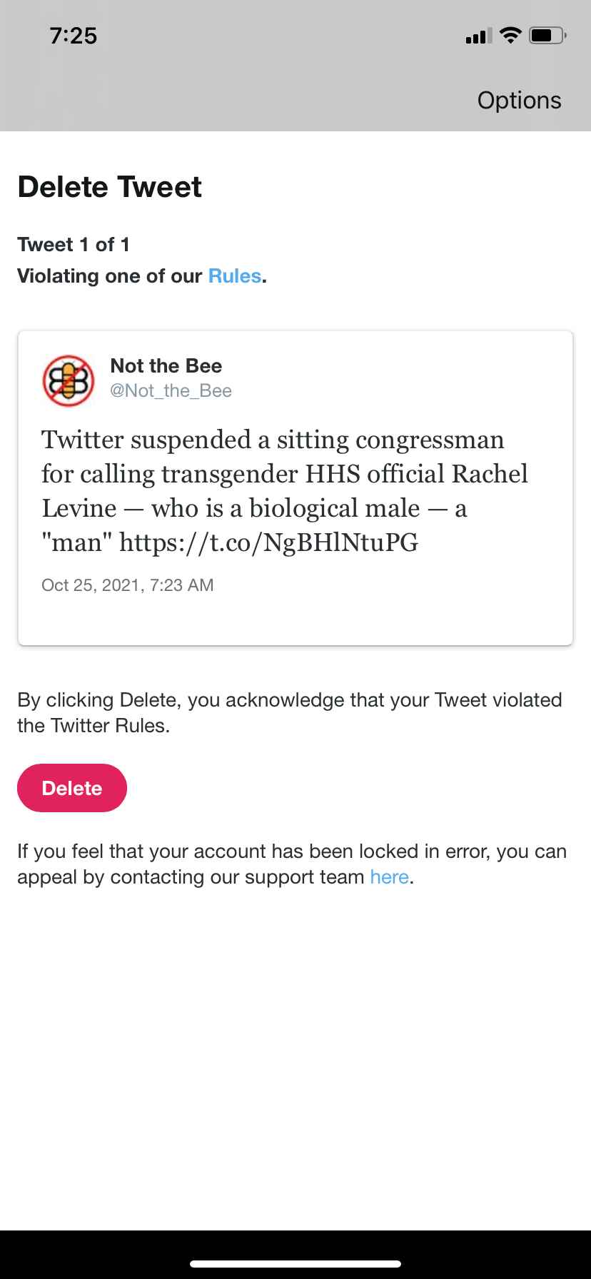 Of you choose to delete, you agree that the tweet is offensive, choose to fight /disagree your account stays locked.