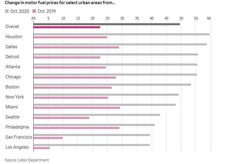 The CPI showed a 30 percent increase in the price of energy in October. The price of gasoline itself increased by a staggering 49.6 percent in October.