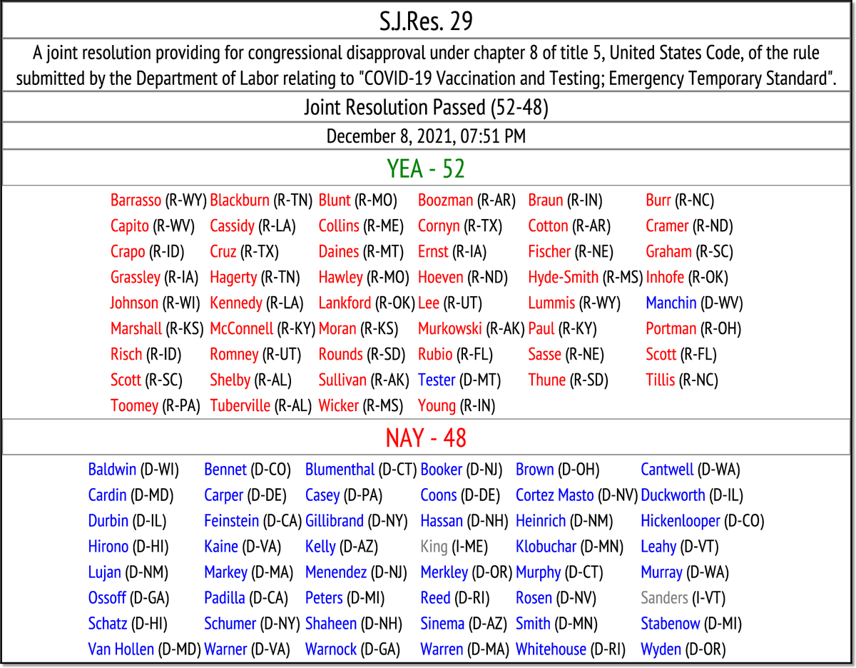 The Senate on Wednesday voted to nix President Biden’s vaccine mandate for larger businesses, handing Republicans a symbolic win.