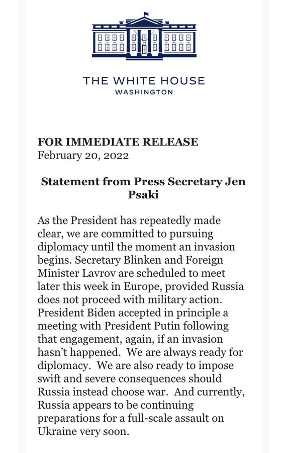 “President Biden accepted in principle a meeting with President Putin following that engagement, again, if an invasion hasn’t happened,” says @PressSec in a statement.