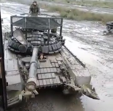 The footage begins with the driver slowing down to a stop as he approaches the Russian tank, which has 'broken down' on the side of the road and waiting for diesel.