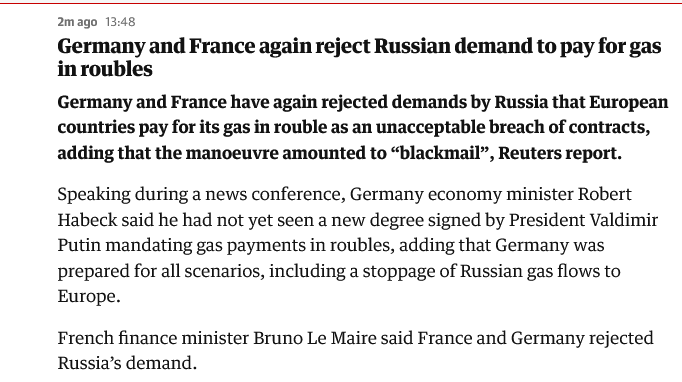 This is the west’s choice. First of all they embargoed Russia and its ability to purchase anything from the west in euros or dollars. And now they want to pay for Russian gas in euros in dollars? Are they stupid or just mentally shut down by their own propaganda? Why would Russia want dollars are useless or euros are useless? Especially when the Federal Reserve outright stole $300 billion from Russia’s forex reserves. What’s stopping them from doing it again from oil revenues? Nothing. That’s why rubles or gold is the only currency that’s going to be acceptable to Russia going forward. Thats what Europe they’re going to pay in whether they accept it or not.