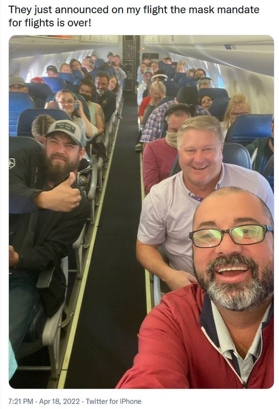 It is terribly sad that the simple freedom to travel without a diaper on your face is cause for celebration. What a pathetic bunch of spineless losers the world has become. This should NEVER have been allowed to happen in the first place. People need to remember that. There are many in power that must pay a price for what they have done to humanity, or it will simply happen again - most likely by late August.