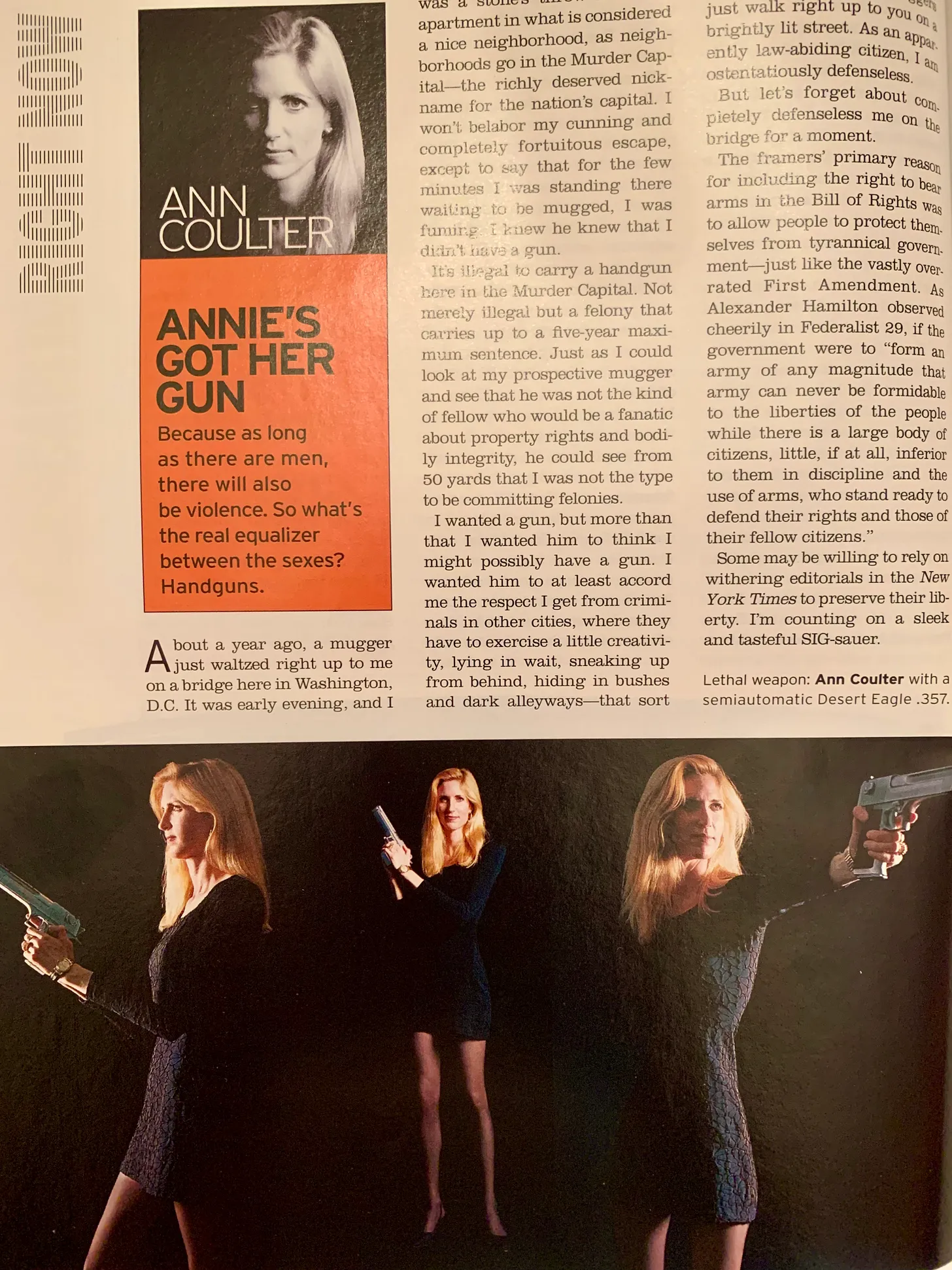 Old article and I've cooled to Ann after her anti-Trump tirades but its still a good message. My son lives in Arlington, VA and it took him close to a year to get a permit, but to get one in DC is near impossible. One of his best friends was a Secret Service agent so when they were together, at least one of them was armed.