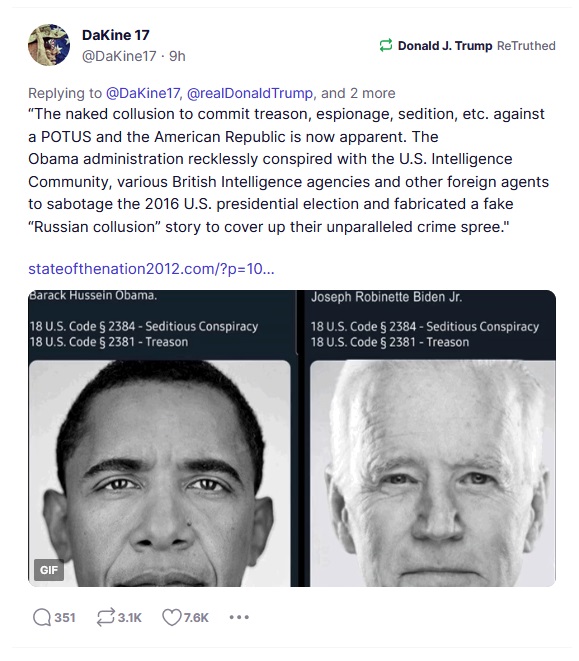Trump retruths images of Biden and Omama with text that say "seditious conspiracy. Treason."