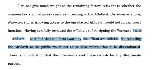 "Having carefully reviewed the Affidavit before signing the Warrant, I was — and am — satisfied that the facts sworn by the affiant are reliable," Reinhart wrote.