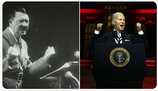 Two Facebook friends posted a photo from today’s speech showing Joe with both fists in the air looking like Adolf . I did a quick search and found a Hitler pic showing a very similar pose and posted to my friends’ page . Within 10 seconds I got a notice that my account was restricted for 24 hours because the photo was regarded as hate speech !!!1