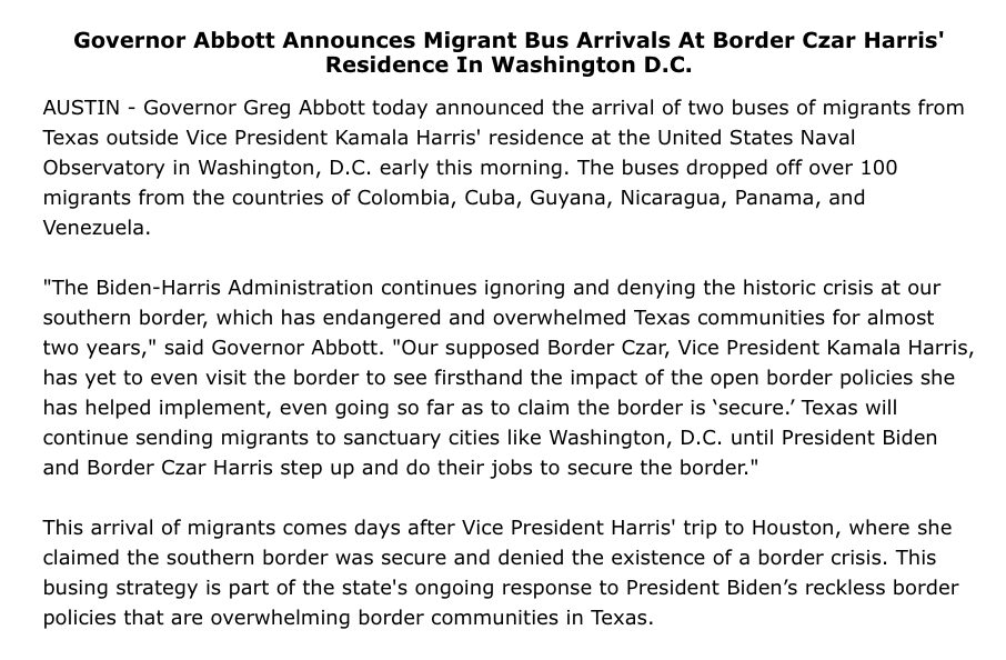Texas will continue sending migrants to sanctuary cities like D.C. until Biden & Harris do their jobs to secure the border. pic.twitter.com/dJKTAvckXB— Greg Abbott (@GregAbbott_TX) September 15, 2022