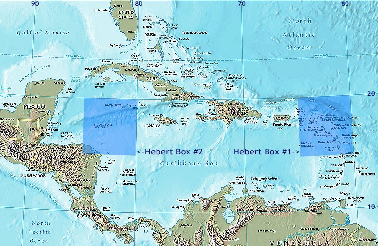 The late-blooming 2022 Atlantic Tropical Storm season is making up for lost time. A tropical system has developed in the Central Caribbean Sea. This storm system is forecast to threaten continental U.S. interests next week. While the tropical wave passed south of a key geographic area known as Hebert's Box #1, it will very likely pass through Hebert's Box #2. These boxes are useful as predictors of hurricanes that will strike South Florida. For more information about Hebert's Boxes, see Hebert Box. See graphic below which illustrated the Hebert's Boxes.