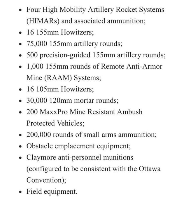 Included in the latest package are four High Mobility Artillery Rocket Systems, also called HIMARS, and associated munitions; 16 M777 155 mm Howitzers; 75,000 artillery rounds for the Howitzers, as well as 500 M982 Excalibur precision-guided rounds; 1,000 155 mm rounds of remote anti-armor mine systems; 16 105 mm Howitzers; 30,000 120 mm mortar rounds; 200 MaxxPro mine-resistant, ambush-protected vehicles, or MRAPs; 200,000 rounds of small arms ammunition; obstacle emplacement equipment and Claymore anti-personnel munitions.