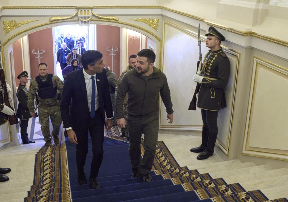 British Prime Minister Rishi Sunak promised 125 anti-aircraft guns and other air-defense technology as he made an unannounced visit Saturday — his first — to Ukraine’s snow-blanketed war-time capital for talks with Ukrainian President Volodymyr Zelenskyy.