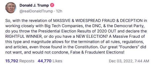 The former president made his observation via his Truth Social account on Saturday following journalist Matt Taibbi’s thorough report on Twitter’s internal communications during the 2020 elections at the behest of newly-minted CEO Elon Musk.