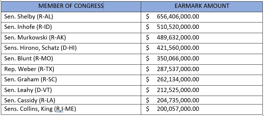 The top earmarking members were mostly Senate Republicans – seven of the top ten.