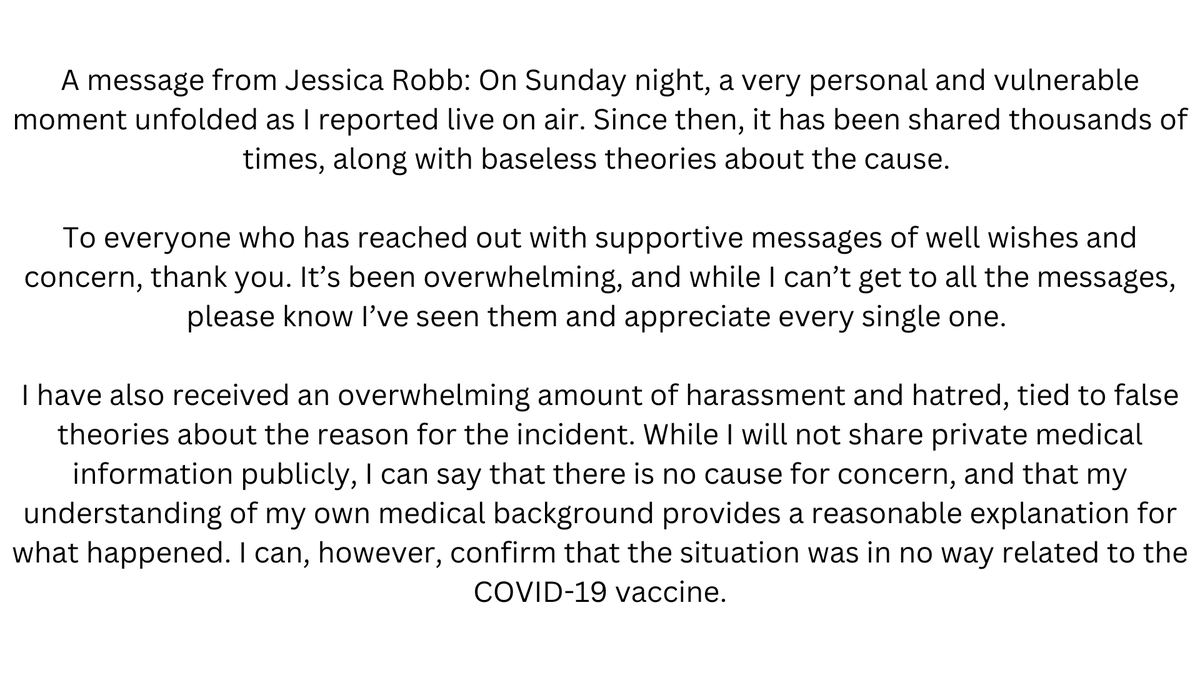 “False. A statement from CTV on Jessica Robb’s behalf said the incident was not related to the COVID-19 vaccine.”