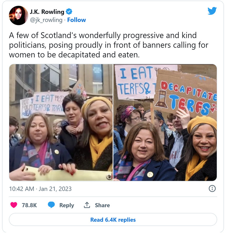 On Sunday, Rowling criticized Scottish politicians for participating in a demonstration in which at least several "trans" activists person had signs reading "Decapitate TERFs" - among other disturbing slogans.