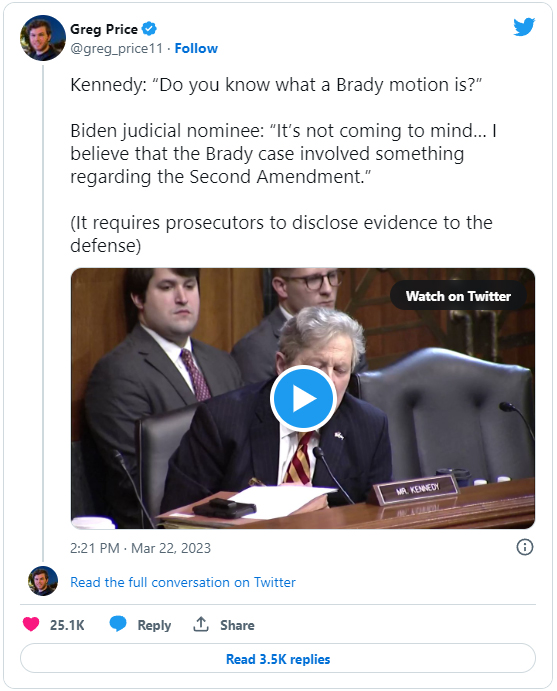 The Republican senator then asked Crews if he was aware of Brady v. Maryland. Crews confirmed that he was aware of the case, then said — quite shockingly — that the case addressed Second Amendment rights.