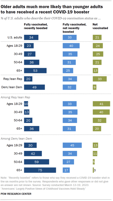 There are wide differences between political parties when it comes to COVID-19 vaccination status, as well as differences within each party group by age, consistent with past Center findings.