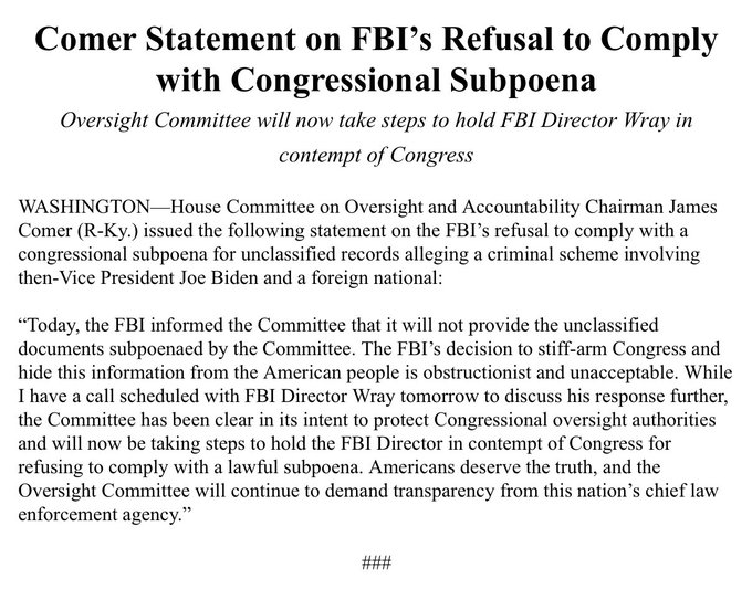 Today, the FBI informed @GOPoversight that it will not provide the unclassified documents subpoenaed by the Committee.