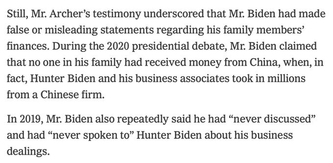 NYT: 'Mr. Archer’s testimony underscored that Mr. Biden had made false or misleading statements regarding his family members’ finances.' https://nytimes.com/2023/07/31/us/politics/hunter-biden-devon-archer.html