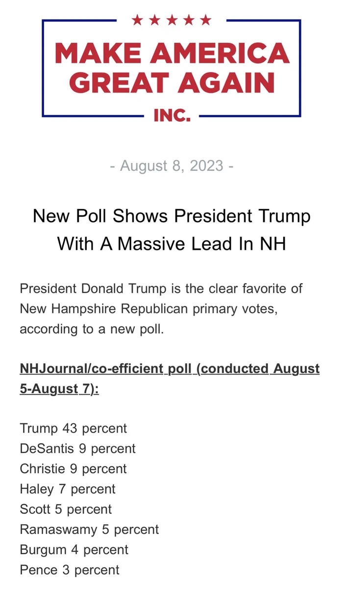 President Trump Holds BIG Lead in New Hampshire! https://t.co/zXJO9WQ1hU— Team Trump (Text TRUMP to 88022) (@TeamTrump) August 8, 2023