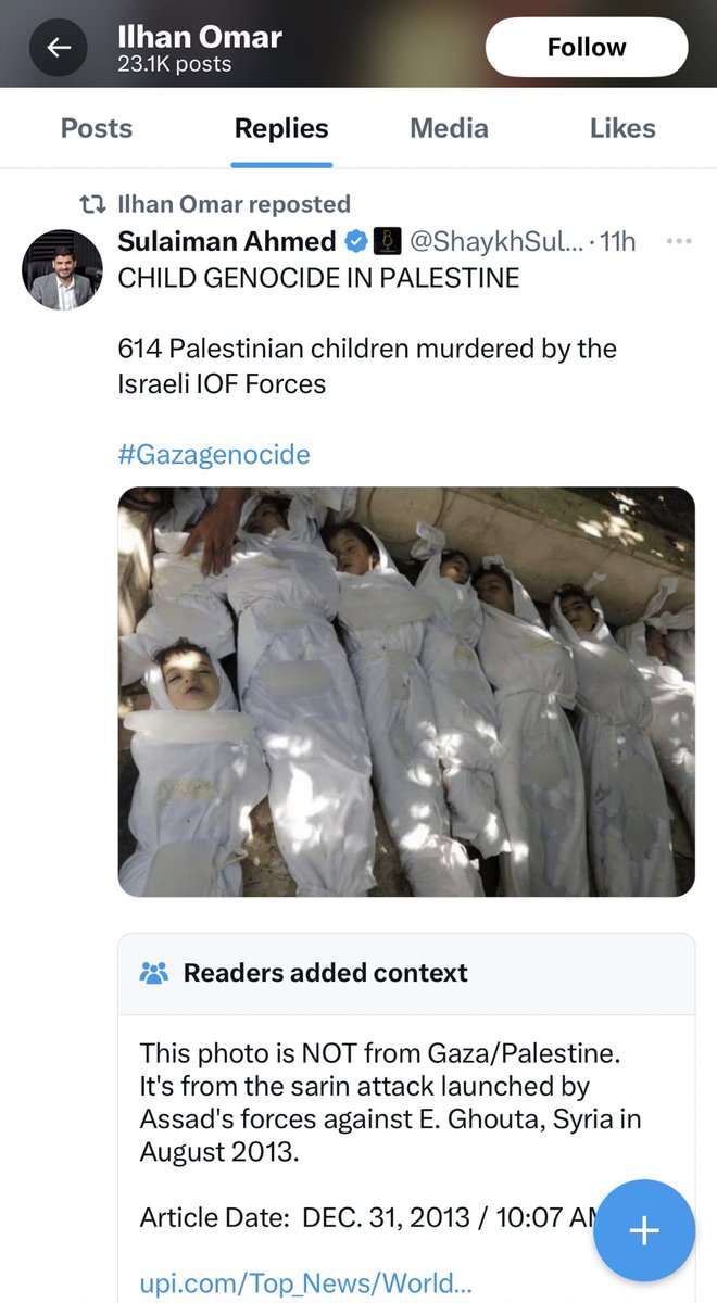 Omar’s response to the massacre by Hamas terrorists killing innocent civilian noncombatants, including children, was to post an image of children, dead, wrapped in white, lying on the floor.