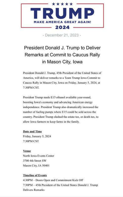 President Trump will deliver remarks throughout Iowa in Sioux Center and Mason City today. Tune in for all-day coverage on RSBN starting at 3 pm ET!https://t.co/2bD1U53Bj2— RSBN 🇺🇸 (@RSBNetwork) January 5, 2024