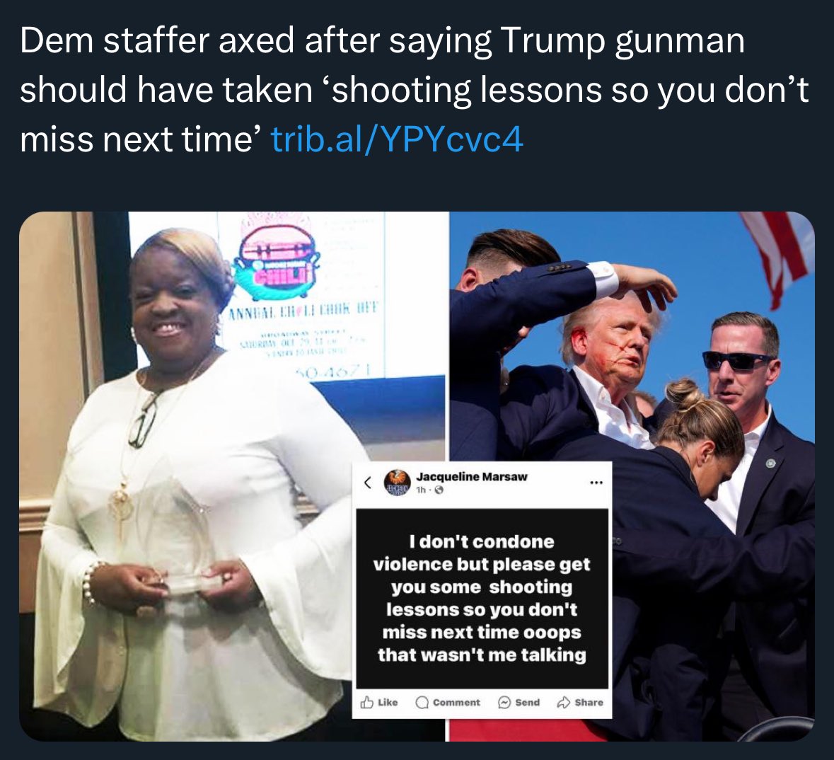 Jacqueline Marsaw, who listed her job as a field director for Thompson on her Facebook profile, reportedly wrote, “I don’t condone violence but please get you some shooting lessons so you don’t miss next time ooops [sic] that wasn’t me talking.”