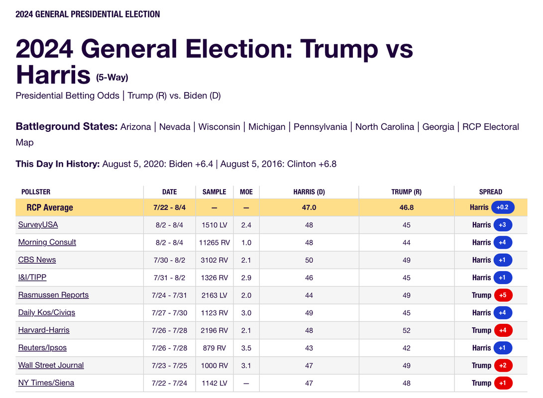 Real Clear politics has Harris ahead by .02. SUSA and Morning Consult, the two newest ones, had Trump ahead of Biden in their last polls. Now Harris is ahead.