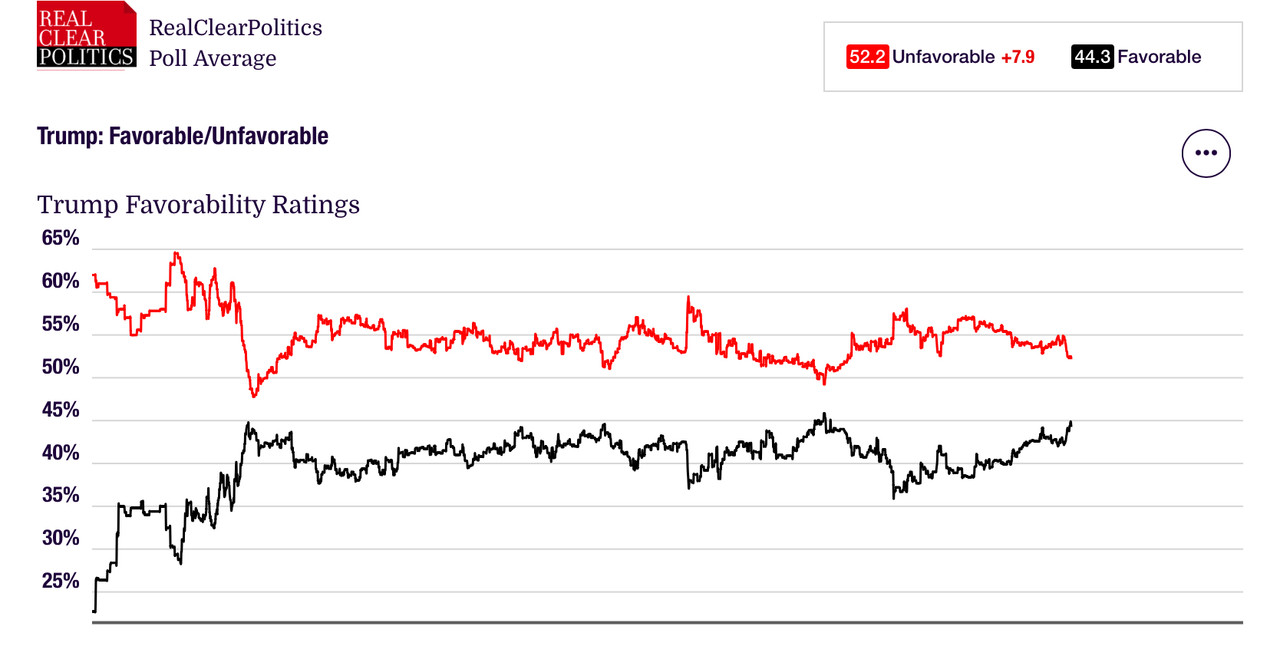 Trump’s favorability rating in the RealClearPolitics average is less than one point below his highest approval rating, marked in April: