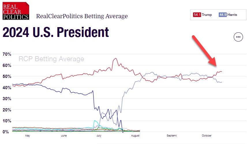 And finally, there’s the insider stuff. I’m reluctant to talk about it because insiders typically dwell inside a bubble. They may mean well, and they may be trying to give you their best information, but their perspective is sometimes skewed by where they sit. Yet, in this case, the insiders all seem pretty darn confident. I’m not going to name names because lawyers never break confidentiality, but I had the chance to talk to a number of people who are pretty deep in the know and who you may recognize. They are overwhelmingly positive about Donald Trump’s chances. They believe that Donald Trump is moving ahead and that Kamala Harris’s manifest failings are beginning to take hold and drag her down.