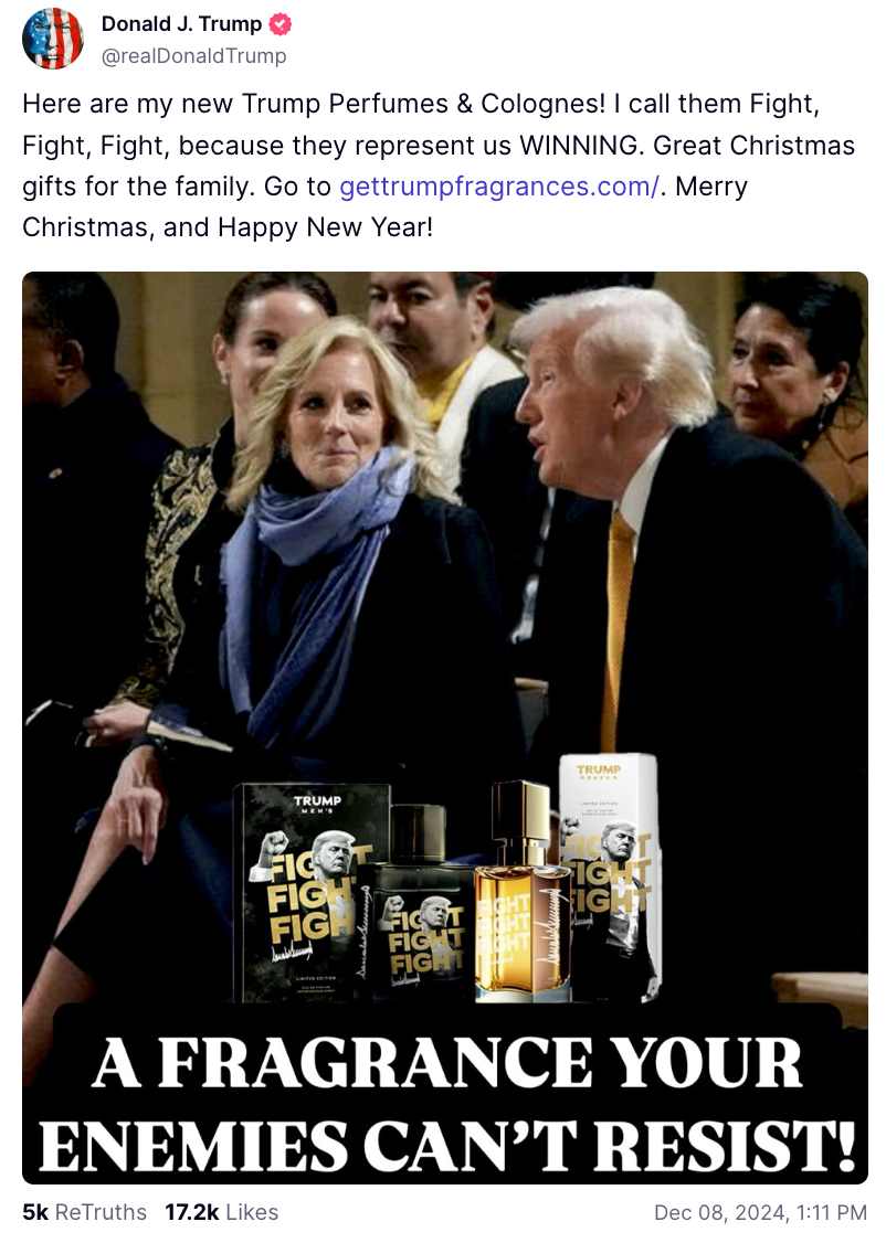 “It’s politics. You have to get used to it,” he said about their past political spats. “She was very nice and we had a very nice conversation.” So how did Trump repay Jill Biden’s kindness? By featuring her in an ad for his new Trump-brand fragrances without her consent. He announced his perfume and cologne line with a Truth Social post that showed a photo of Biden smiling at Trump with the tag line “A fragrance your enemies can’t resist.”