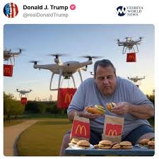 The image, which appears to be AI-generated, shows Christie hunched over a large spread of McDonald’s food while half a dozen drones fly toward him with more fast-food deliveries in tow: