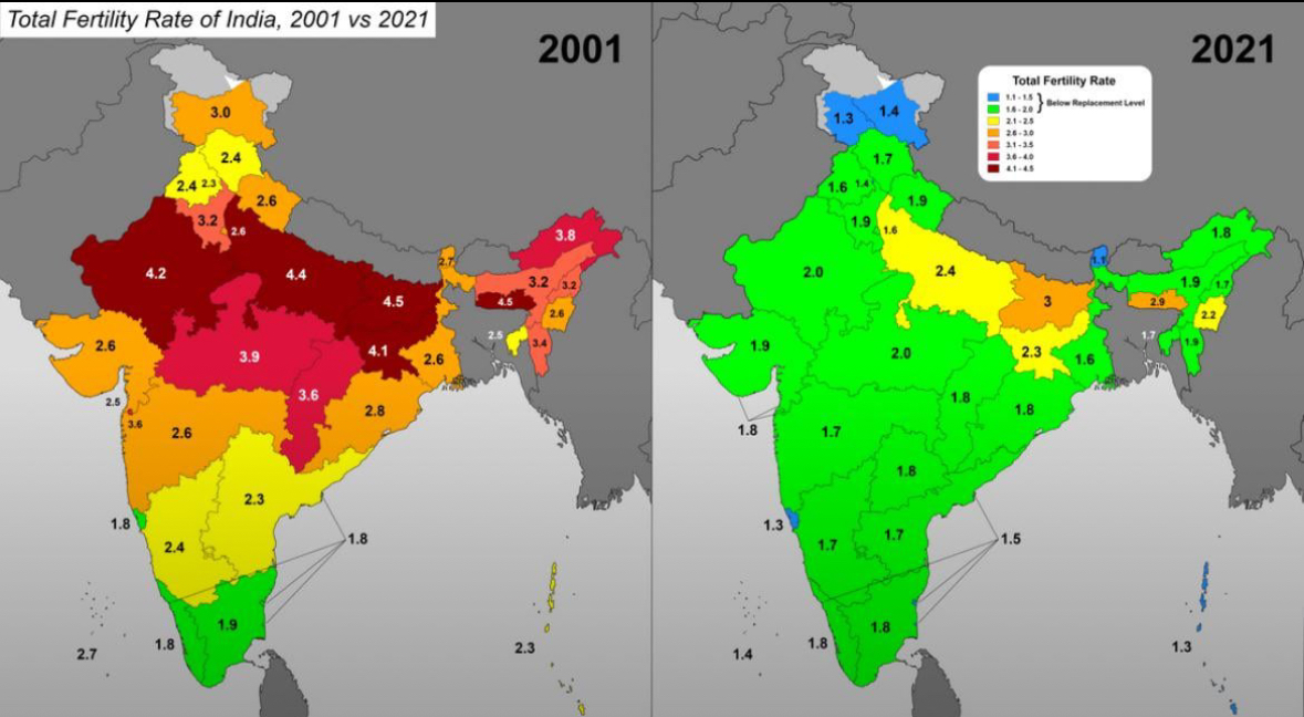 Today, the five southern states have total fertility rates below 1.6, with Karnataka at 1.6 and Tamil Nadu at 1.4. In other words, fertility rates in these states match or are less than many European countries.