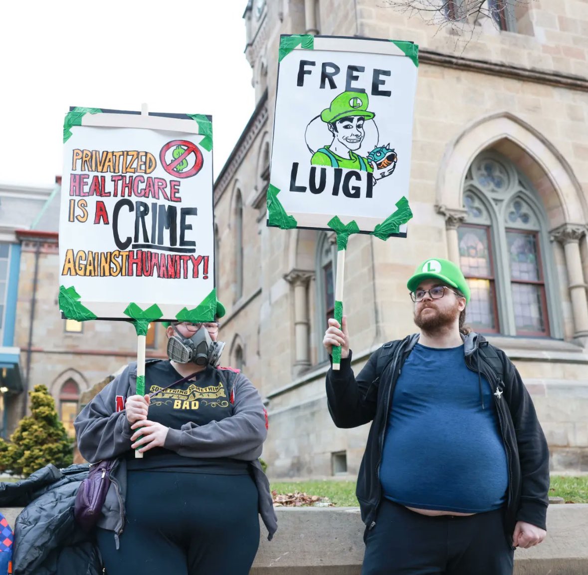 The protesters stood on the sidewalk outside the Blair County Courthouse holding signs with messages like, “Murder for profit is terrorism” and “The one who’s responsible for the deaths of many is NOT Luigi Mangione.” Some signs also called Mangione a hero, according to footage from WGAL.